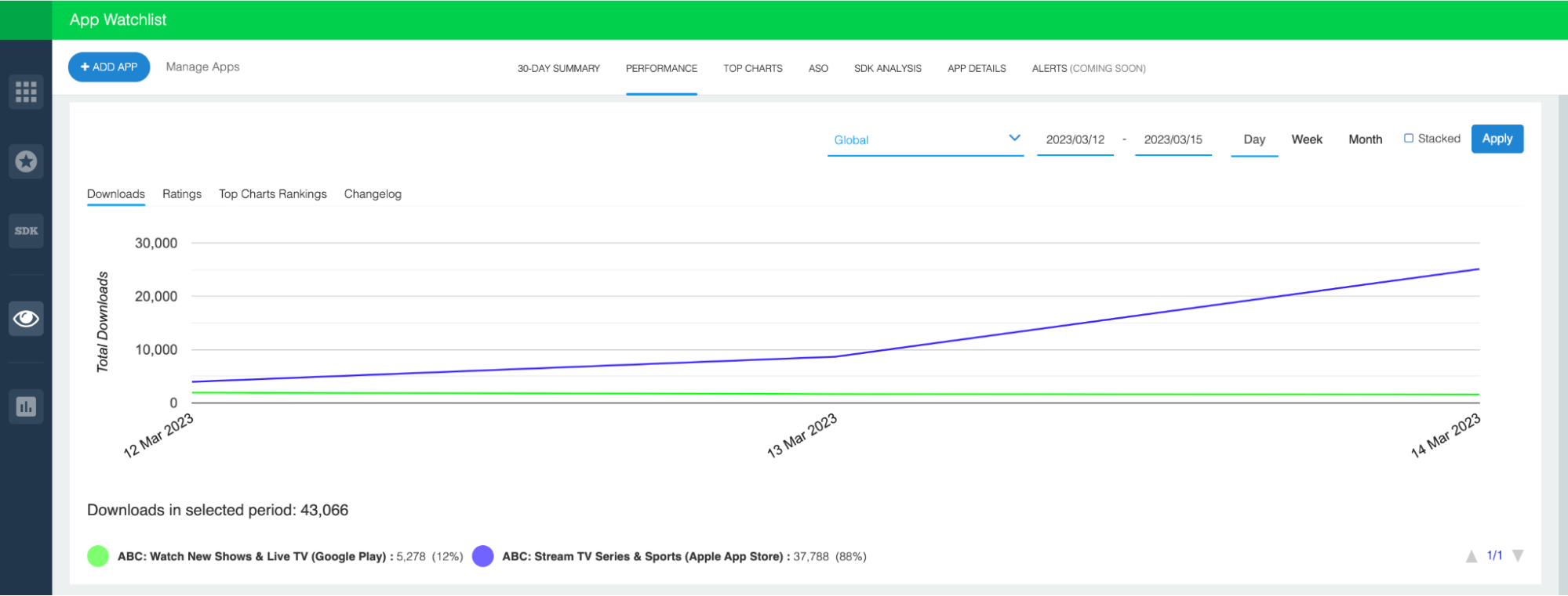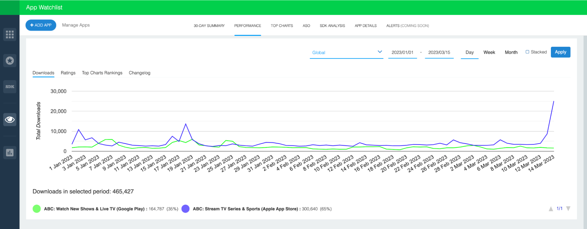 The chart above depicts daily global downloads for both the iOS (blue) and Android (green) versions of the ABC app in 2023, year to date.