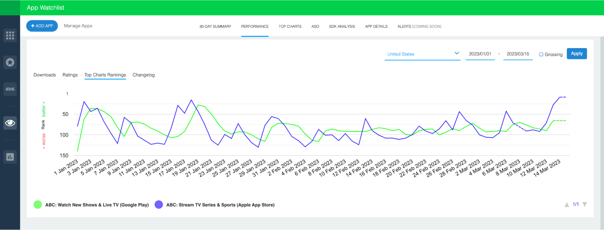 However, a massive chunk of these downloads came in the run-up and aftermath of the 2023 Academy Awards, which aired Sunday, March 12th. In the three days since then, ABC has been downloaded a whopping 43,066 times. This includes 5,278 Android downloads and 37,788 iOS downloads. See here:
