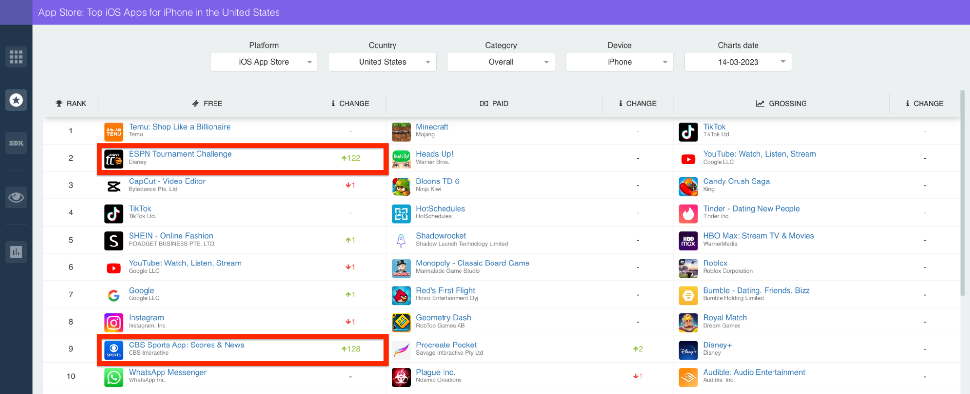 What’s more, with college basketball’s March Madness just around the corner, Paramount+, Disney+, ESPN+, and other streamers are likely to get major boosts in the near future. Indeed, apps like ESPN Tournament Challenge and CBS Sports App: Scores & News have already shot up US top charts, rising 122 and 128 spots, respectively, overnight: