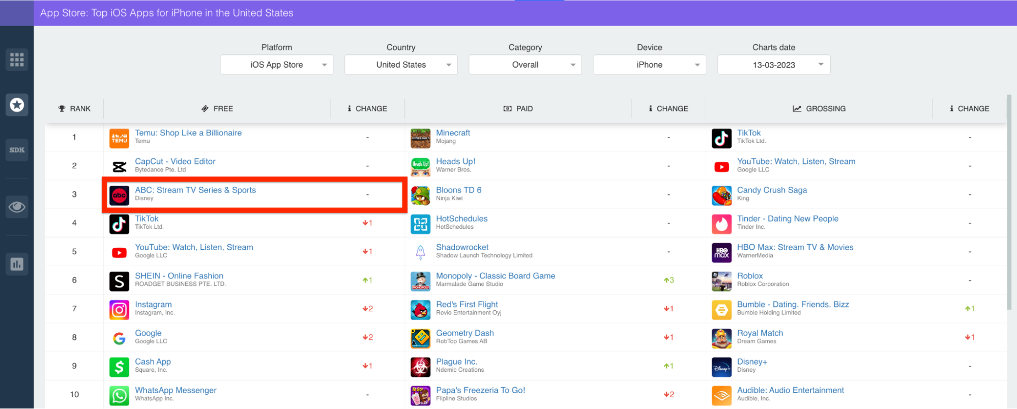 Indeed, on Monday morning, the iOS version of ABC: Stream TV Series & Sports reached number three in the United States, briefly surpassing TikTok, YouTube, SHEIN, and, well, just about everyone else. Check it out: