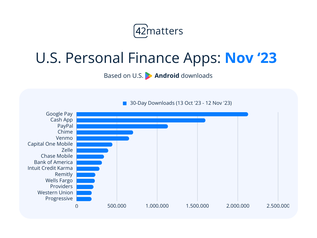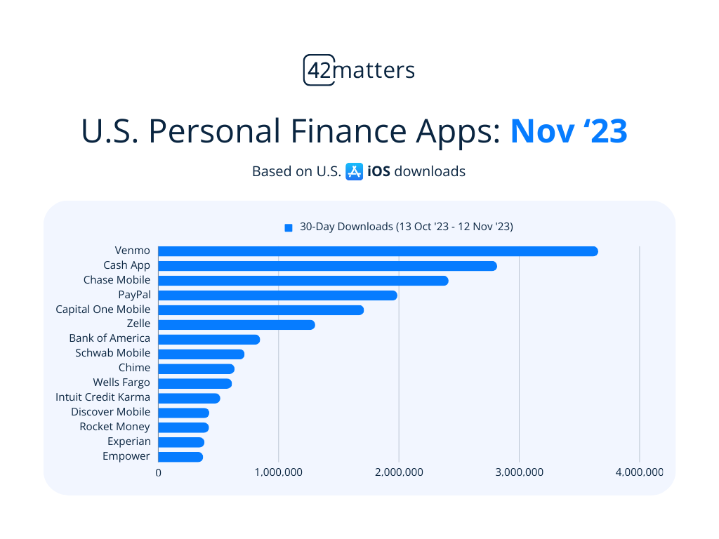 Venmo, Cash App, and PayPal were the most popular “Personal Finance” Apps in the United States in November 2023. We breakdown the top 15 iOS and Android “Personal Finance” apps heading into the holiday season.