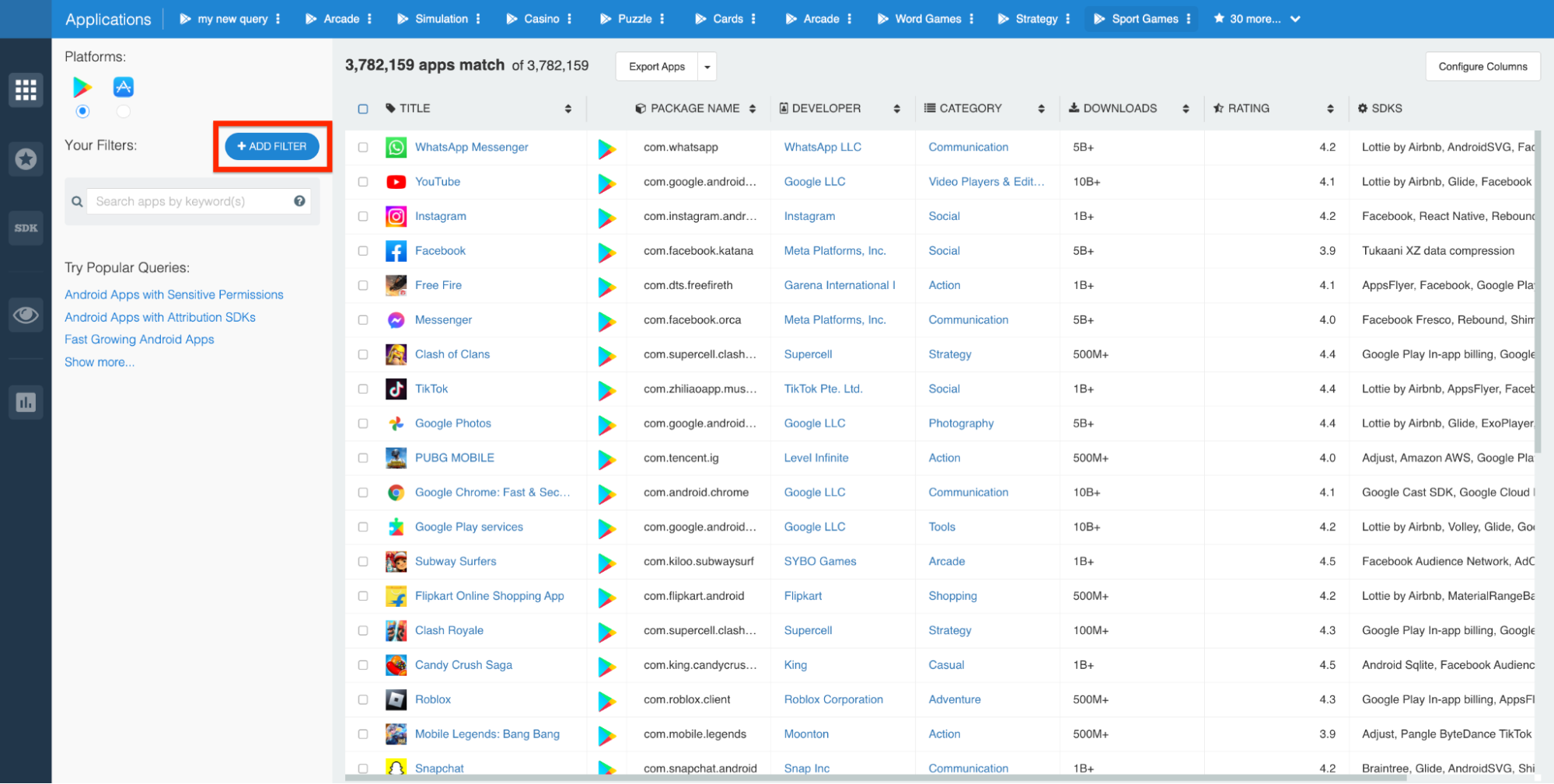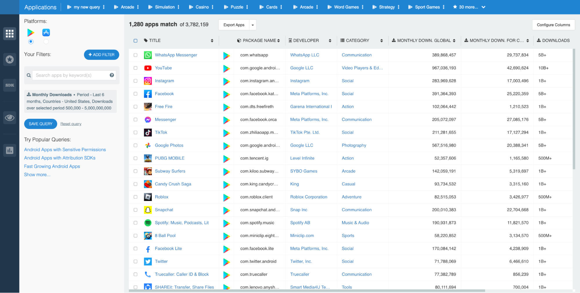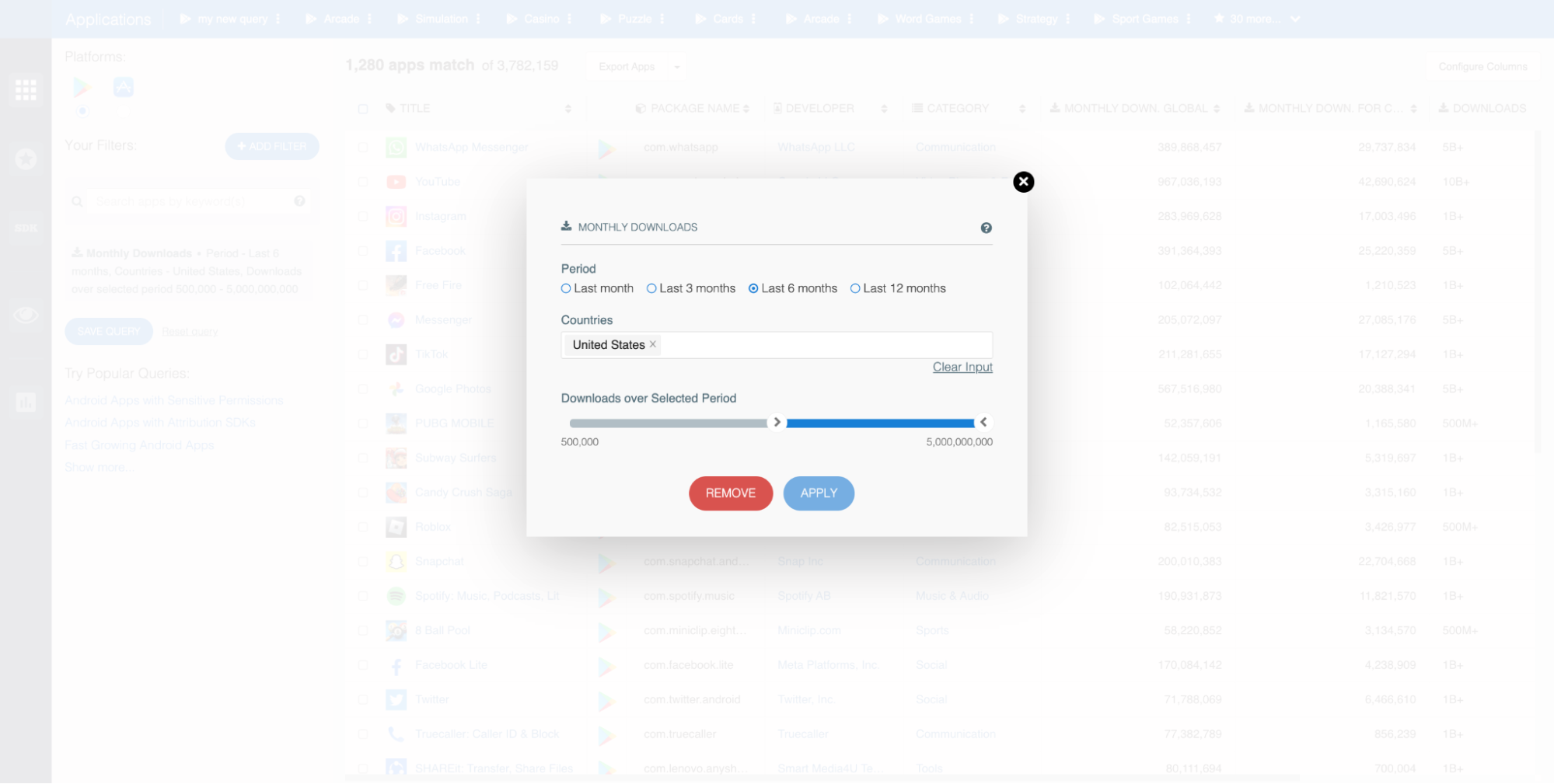 To demonstrate, we adjusted the filter to identify all apps with at least 500,000 downloads in the United States over the last six months: