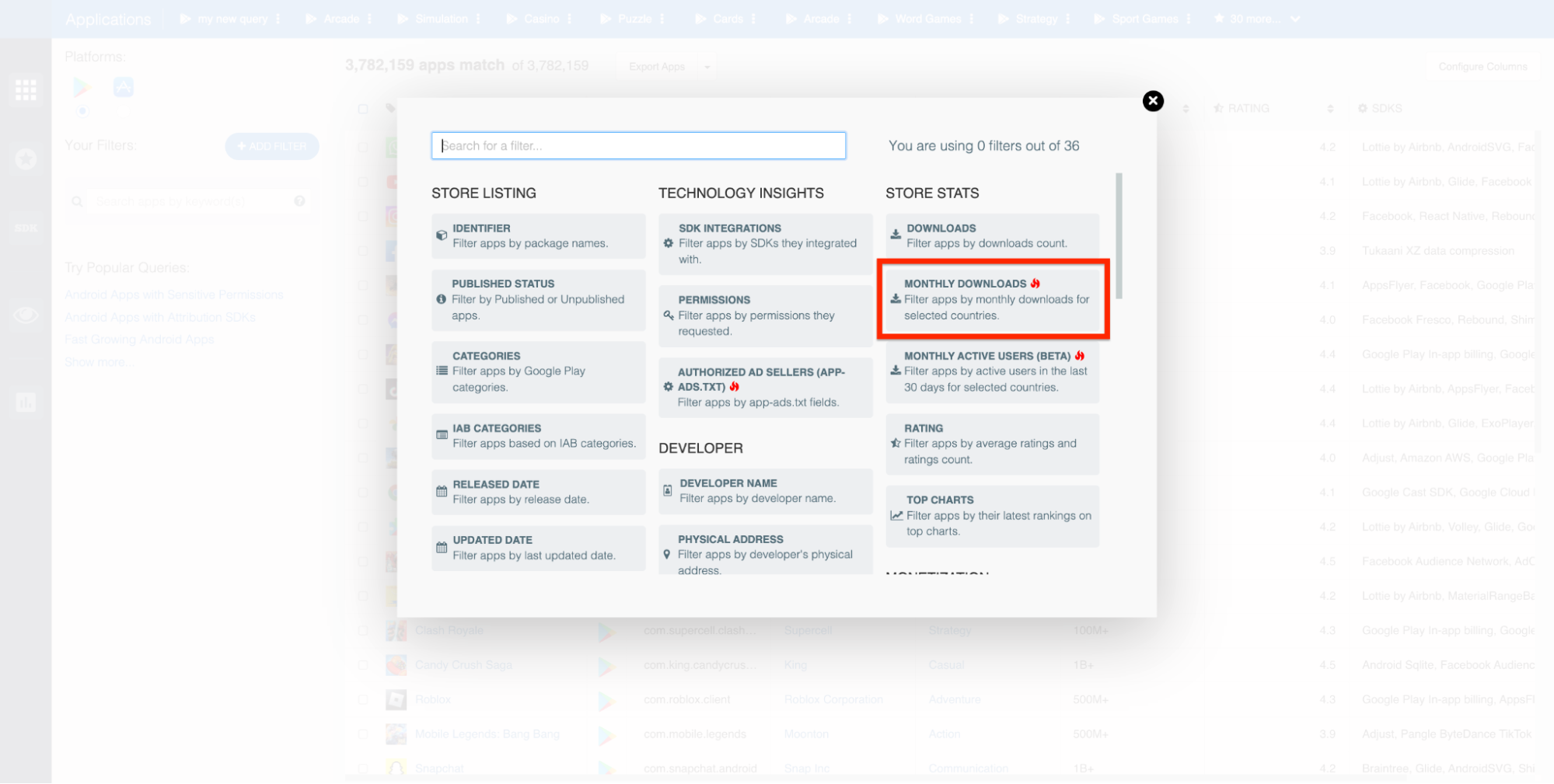 This will open up a pop-up that lists each of the Explorer’s filters, including MONTHLY DOWNLOADS, which appears in the STORE STATS section of the pop-up.