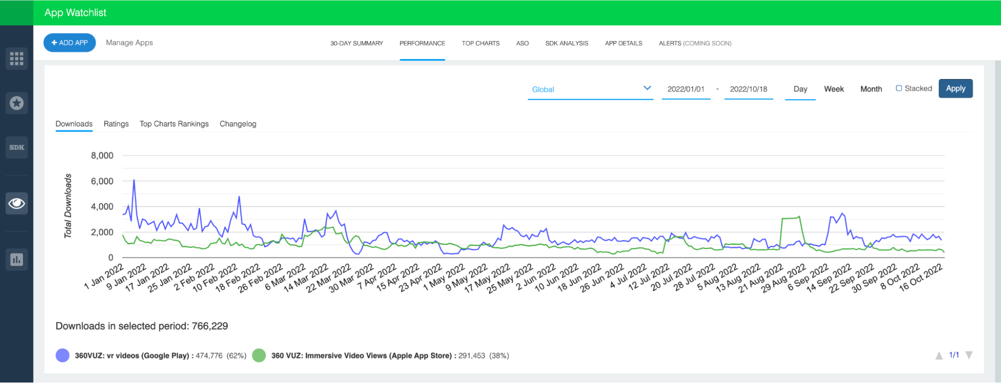 This chart depicts daily global downloads for the iOS (green) and Android (blue) versions of VUZ between January 1st, 2022 and October 18th, 2022.