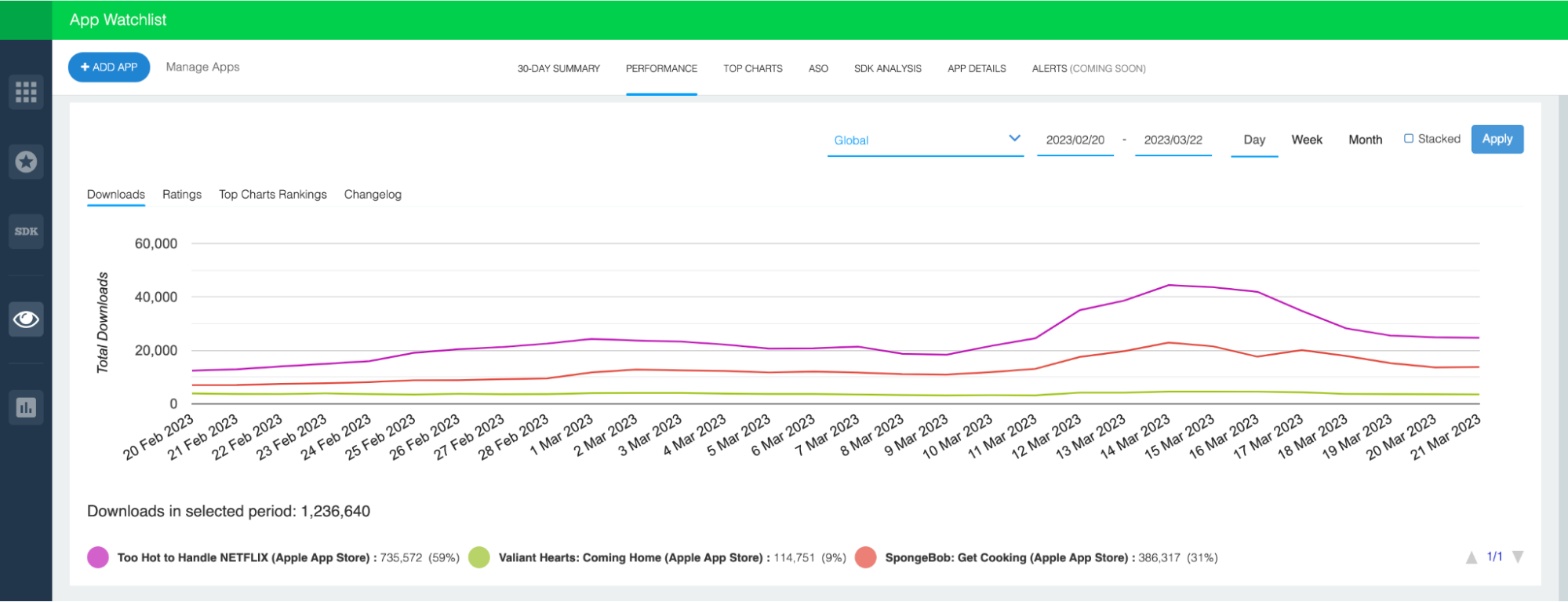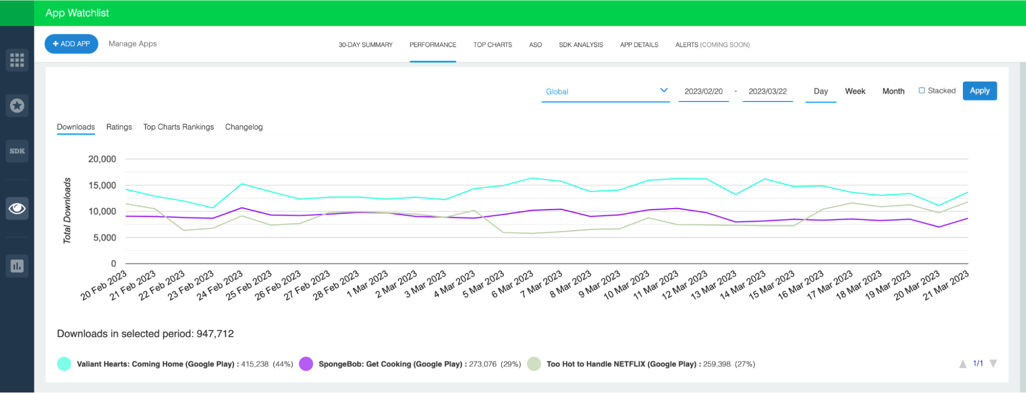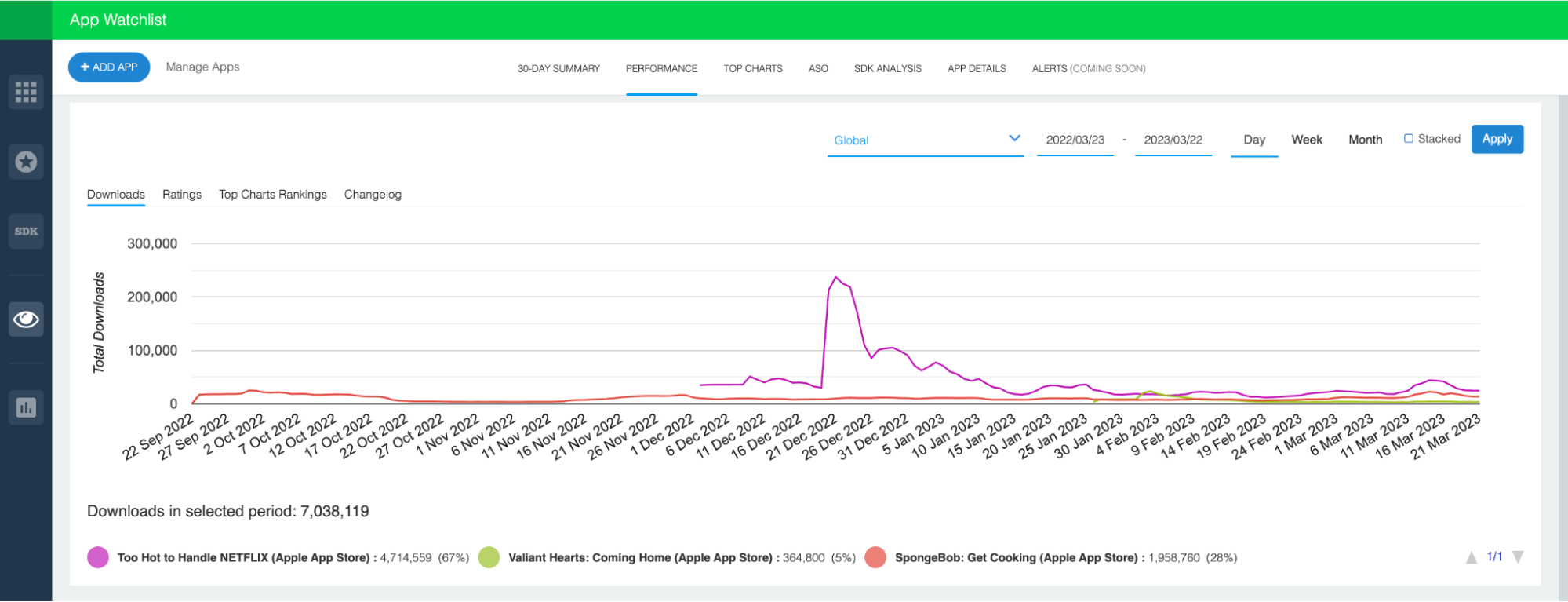 Like the previous chart, this one shows daily global downloads. Except these are for Netflix’s hottest iOS games: Valiant Hearts: Coming Home (green), SpongeBob: Get Cooking (red), and Too Hot to Handle NETFLIX (purple). It likewise shows downloads from September 27th, 2022 until March 21st, 2023.