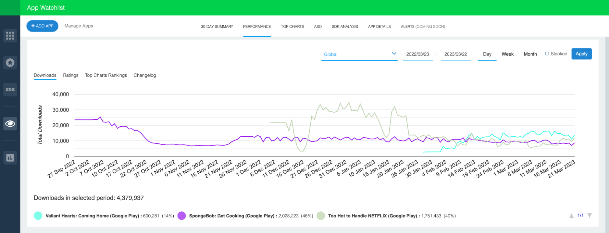 Above you’ll find daily global downloads for the most popular Netflix Android apps: Valiant Hearts: Coming Home (turquoise), SpongeBob: Get Cooking (purple), and Too Hot to Handle NETFLIX (light green). These downloads are from the period between September 27th, 2022 and March 21st, 2023.